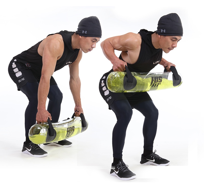 1. Bag forward squat 2. Triceps workout 3. Over-shoulder squat 4. Bench / floor press 5. Left-leg squat 6. Right-leg squat 7. Biceps Lift (Arm Curl) 8. Kettlebell Swing 9. Dead Lift 10. RDL 11. Bend Pull